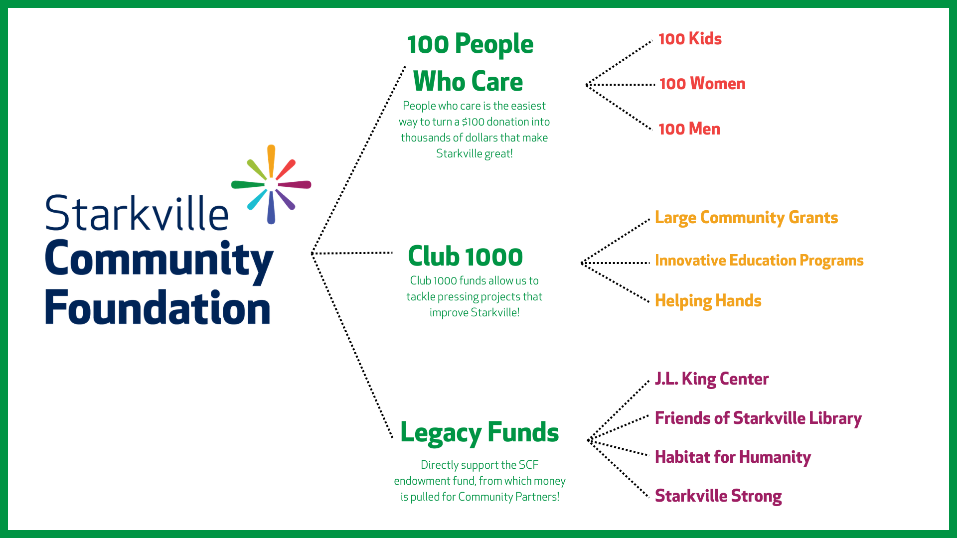 Welcome to the Starkville Community Foundation, YOUR hometown charity. We believe investing in Starkville will create a place we all want to call home for generations to come!
